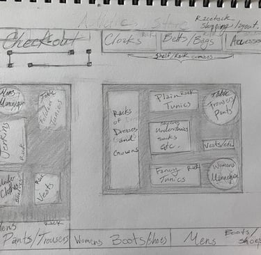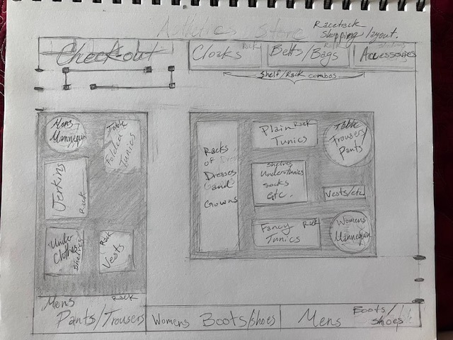 My layout is drawn below, and it will be similar to the style of set up as Target is, with racks, shelves, and tables with folded clothing. It is a racetrack layout style. There are three sections, the Men’s, the Women’s, and the accessories and cloaks section.